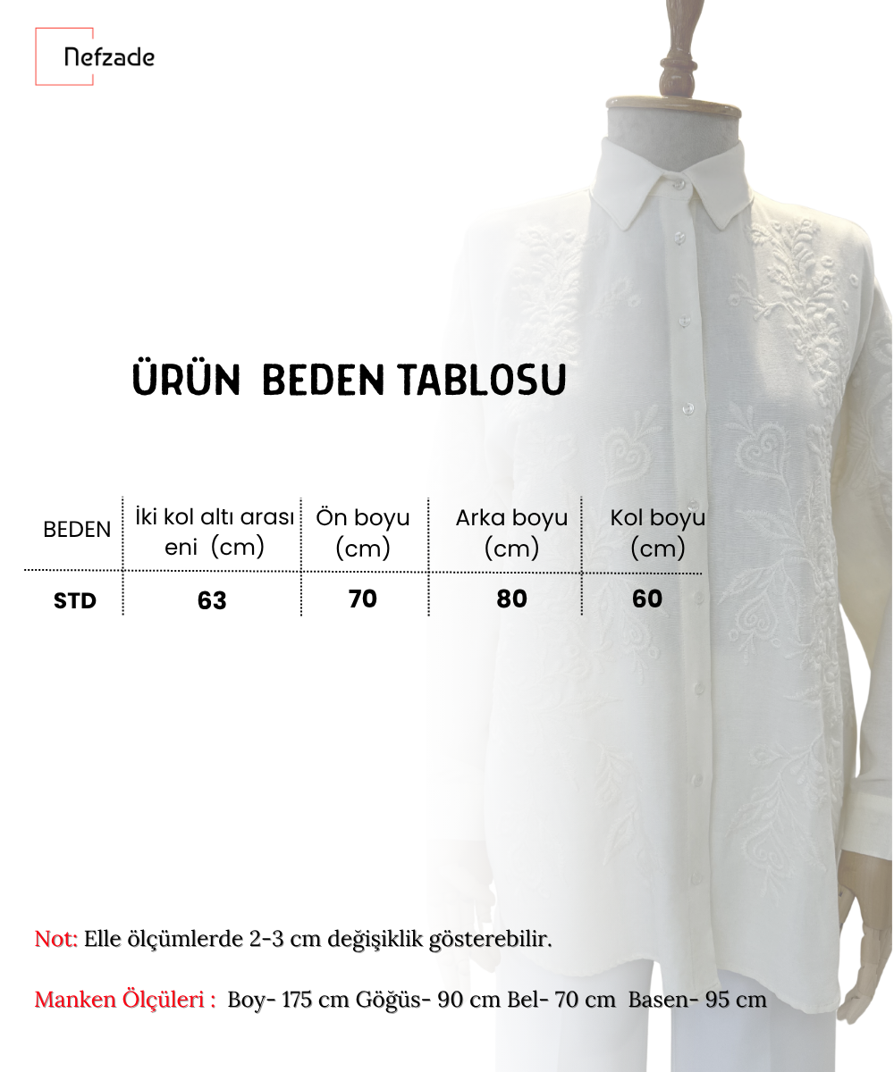 Tamamen ekru tonlarda hazırlanan nakış işlemeleri, kumaşla aynı renkte çalışılarak gösterişsiz ama sofistike bir şıklık sunar.